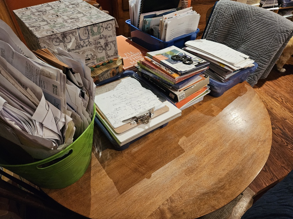 Can you believe that sorting, tidying, and cleaning did NOT take a lot of time? Which is good because I had a LOT of prep work before I could write my final assignment. And I double-dipped on that as I was prepping for one of my classes this weekend, so it all worked out. I think I have all the pictures ready (or almost), so that won't take long to process. Yes --- things are coming together. The less you have, the less you want; it just gets easier to get rid of it.