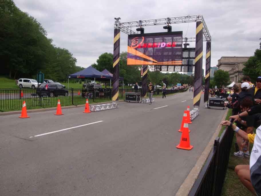 | Waiting to start - see that structure behind the pole on the right. EVERYONE (all 4,610 riders) had to go through that structure. It took EIGHT minutes for us to clear and we were near the front!!!!! |